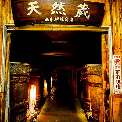 丸井伊藤商店では、昔ながらの味噌造りの製法である天然醸造を行っています。「天然蔵」という場所で、天然二年味噌、三年味噌が背丈よりも大きな木樽で静かに熟成の時を待っています。そうした味噌がどのように造られているのかを工場で見学していただきます。天然蔵にある木樽に直接触れることもでき、味噌の種類や製造方法等を案内人が説明します。