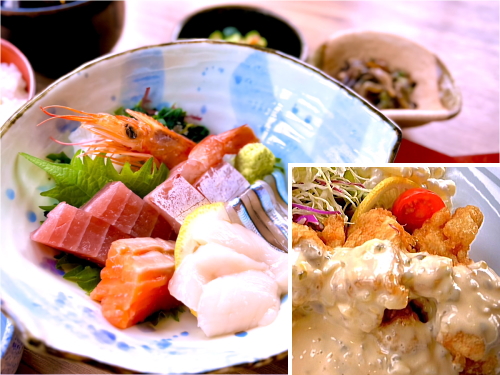 昼食は、青島神社参道入り口に位置する青島屋でお造りに飫肥天、さらにご当地グルメ・チキン南蛮の付いたセットをご用意します。