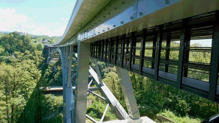天龍峡大橋(三遠南信自動車道・天龍峡IC~千代IC間に架かる橋。全長280m、高さ約80m)の車道の下に設けられた歩道「そらさんぽ天龍峡」は眺下に天竜川や川下り、JR飯田線路を通る鉄道が見え、四季折々の景色が楽しめます。天竜川とJRをまたいでの空中散歩をお楽しみください。