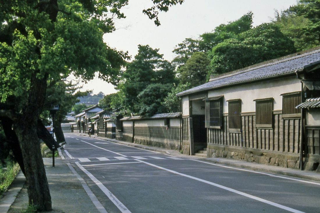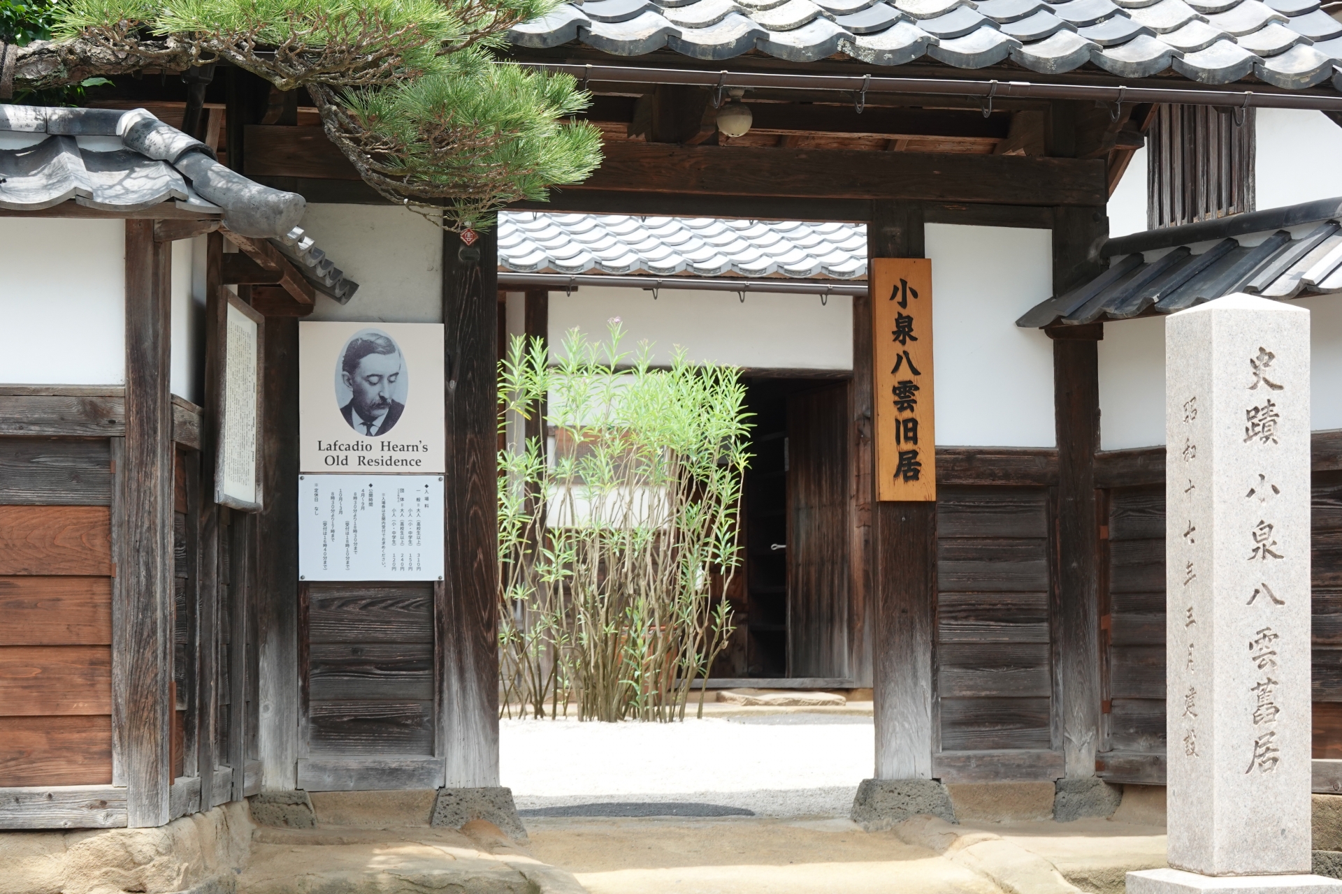 塩見縄手の名称は、松江藩中老の塩見小兵衛の屋敷があったことに由来します。縄手とは平地などに細く延びる一本道のことです。小泉八雲旧居をはじめ、武家屋敷風の家が堀に面して軒を接し、松江で最も城下町らしいたたずまいを残しています。小泉八雲記念館前から明々庵入口に至る延長約500mは、松江市の「伝統美観地区」に指定されています。