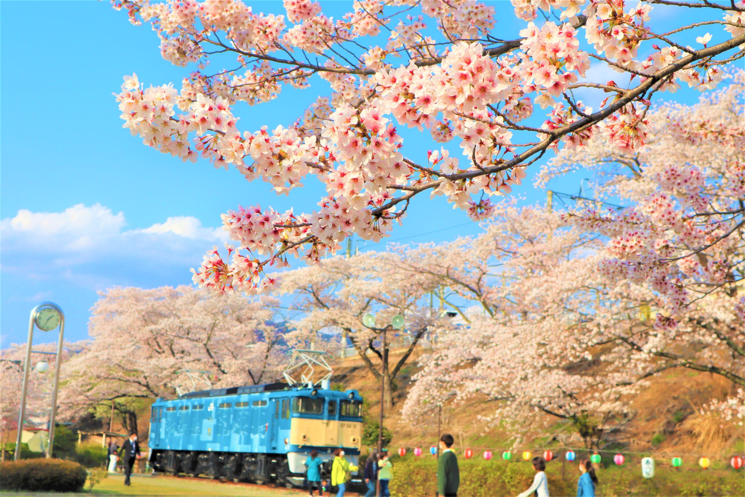 ●甚六桜公園は旧勝沼駅跡地に作られた桜の名所で、六百本の桜のトンネルとその下を走り抜ける列車を見ることができます。