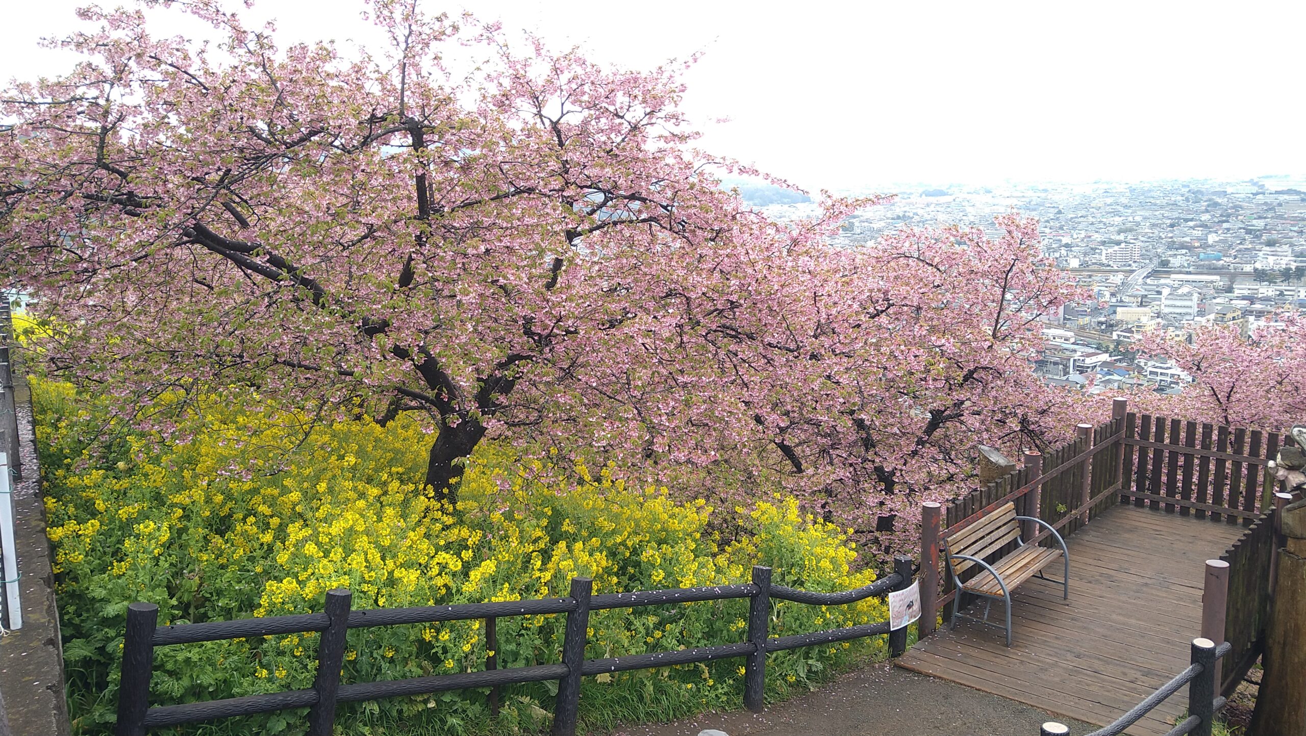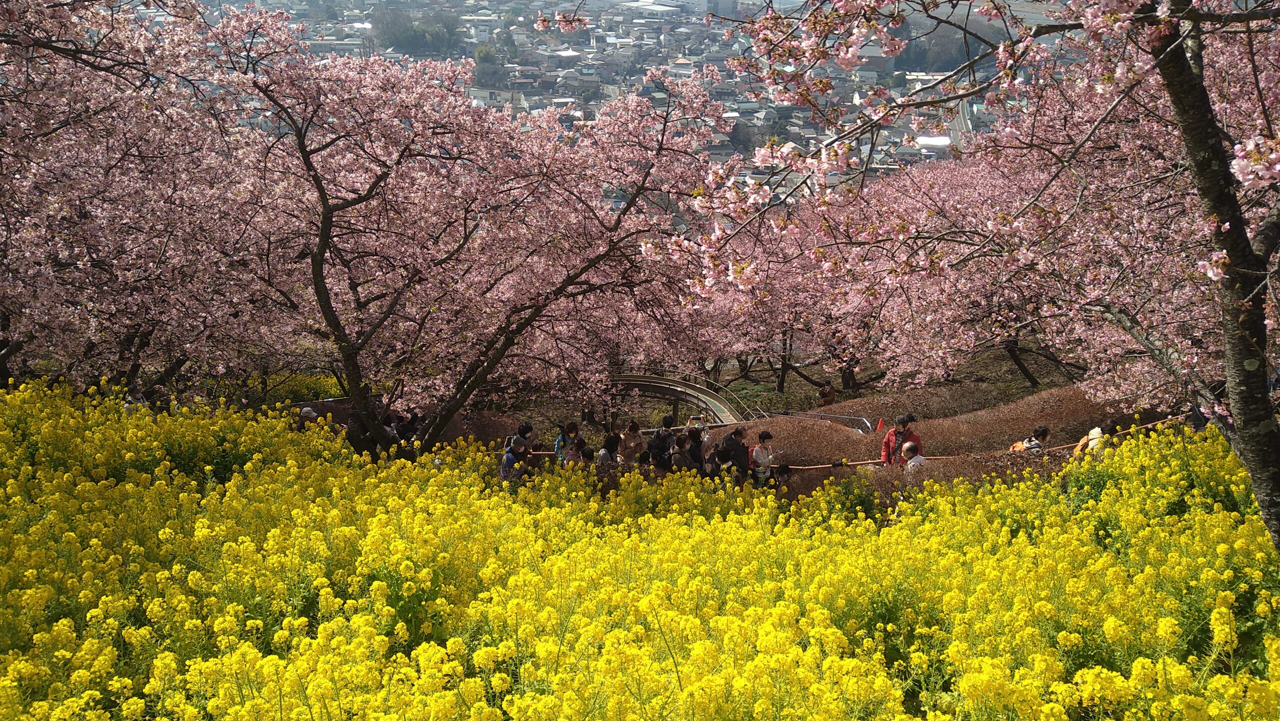 松田山ハーブガーデンに広がる約360本の河津桜と木の下に植えられた菜の花を楽しむことができます。眼前には松田の町並みや箱根の山々、天気が良ければ富士山も望むことができ、シャッターポイントは盛りだくさん。たくさん斜面を昇り降りするので、動きやすい服装がおすすめです。例年のまつだ桜まつり期間中は松田町のみかんや地元の野菜販売の出店、展示ブースのほか、子供が喜ぶ「ふるさと鉄道(ミニトレイン)」も運行されています。
