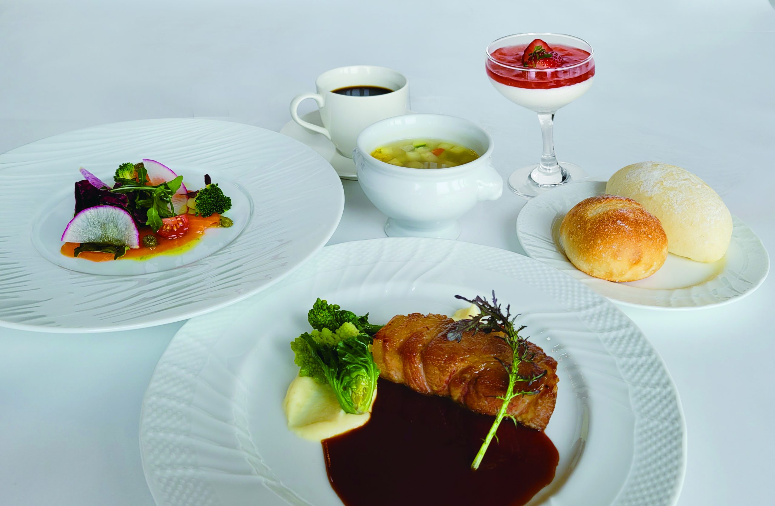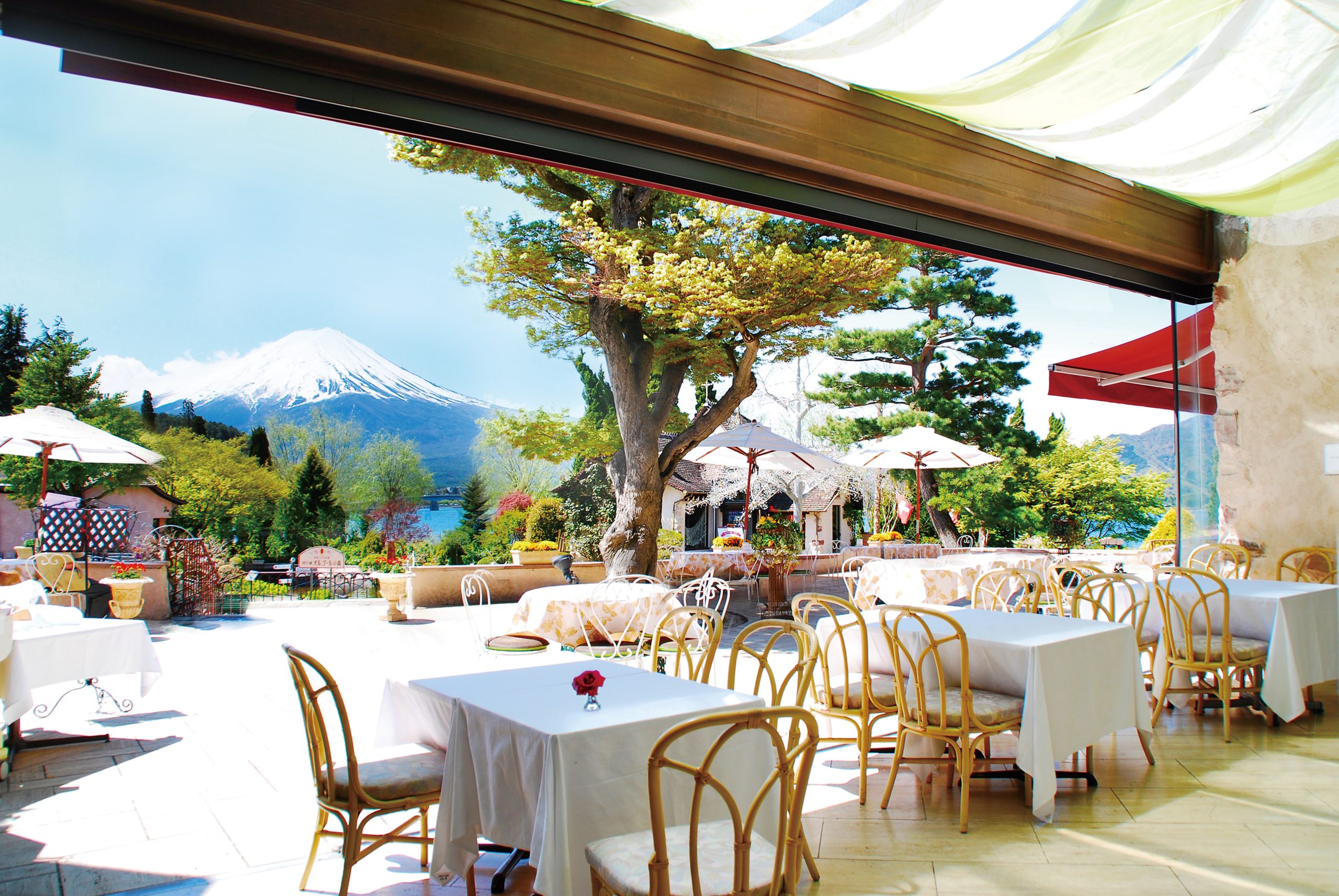 富士山を望む景色と「富士桜ポークのロティランチ」とご一緒に優雅なひと時を堪能できます。