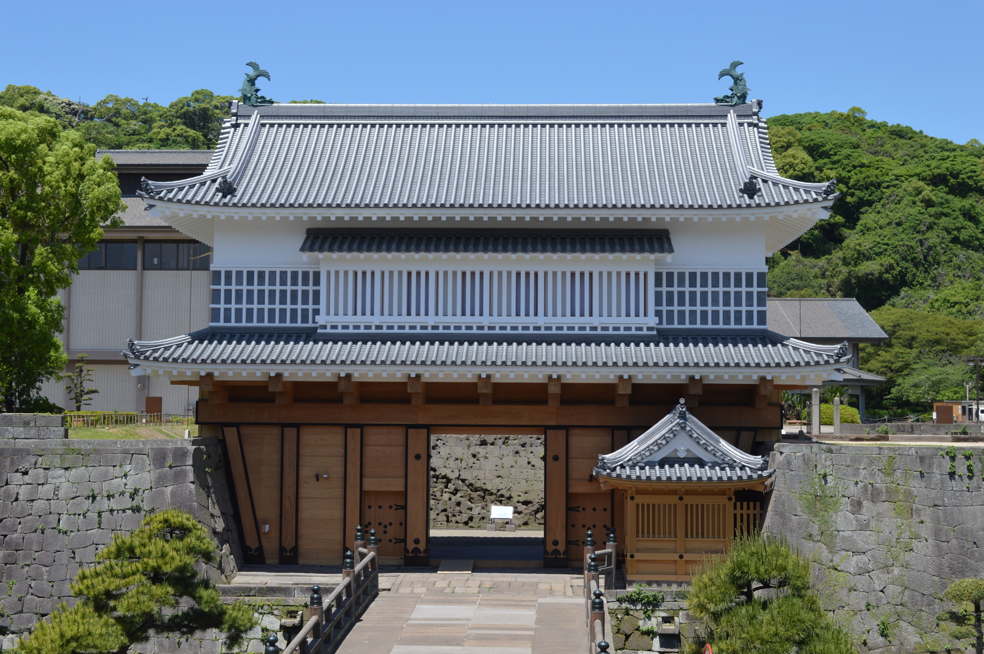 鹿児島城(かごしまじょう)は、慶長6年(1601)、島津家久により築城が開始された。別名を鶴丸城と言います。鹿児島城の水堀は、大大名の城としては小規模で、幅13m、深さ80cmほどと、石垣の高さは6.6mしかない。背後の城山は高さ108m、5つの曲輪から成る。よくある背後の城山から桜島の眺望は、このうち1つの曲輪からの眺望となる。
