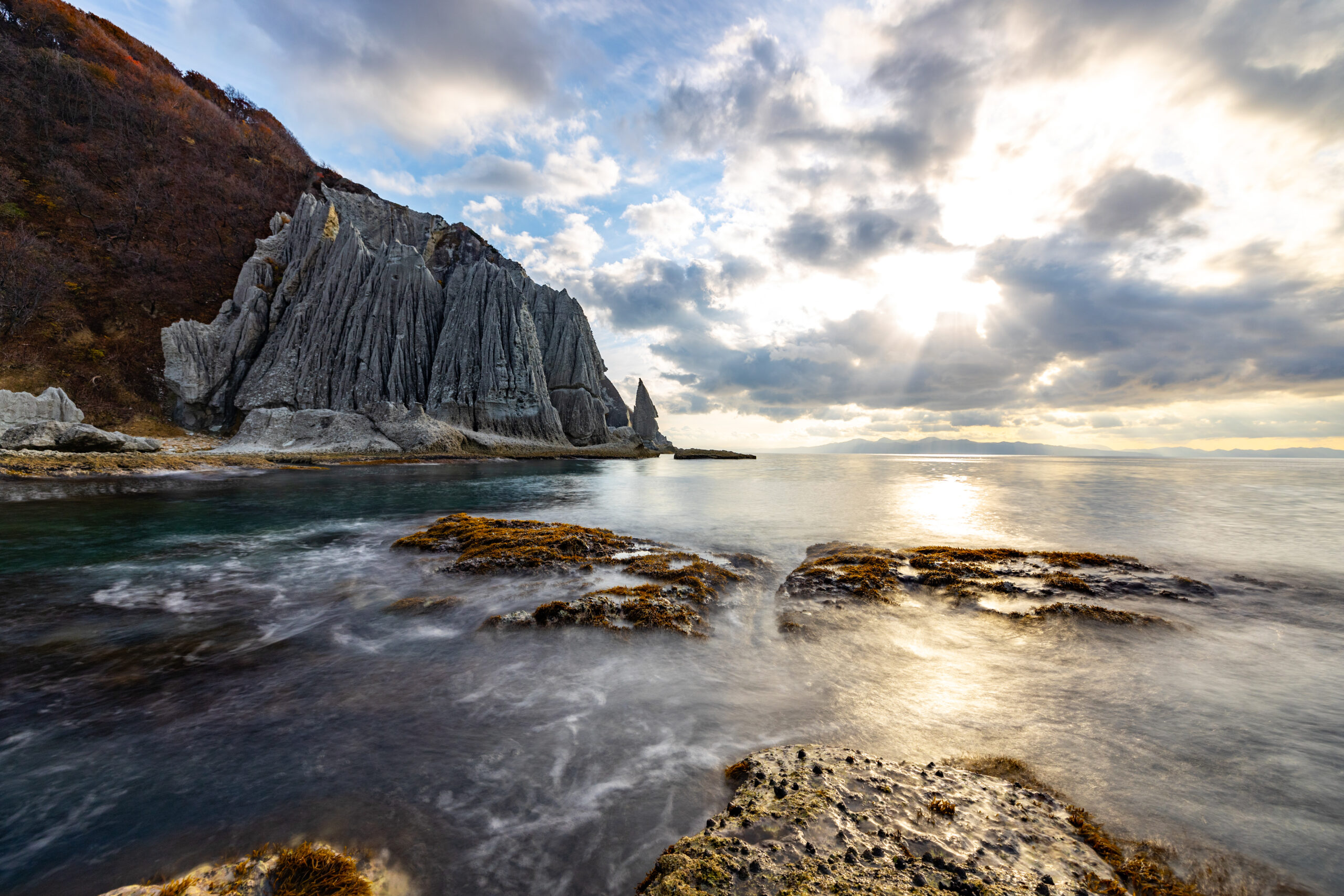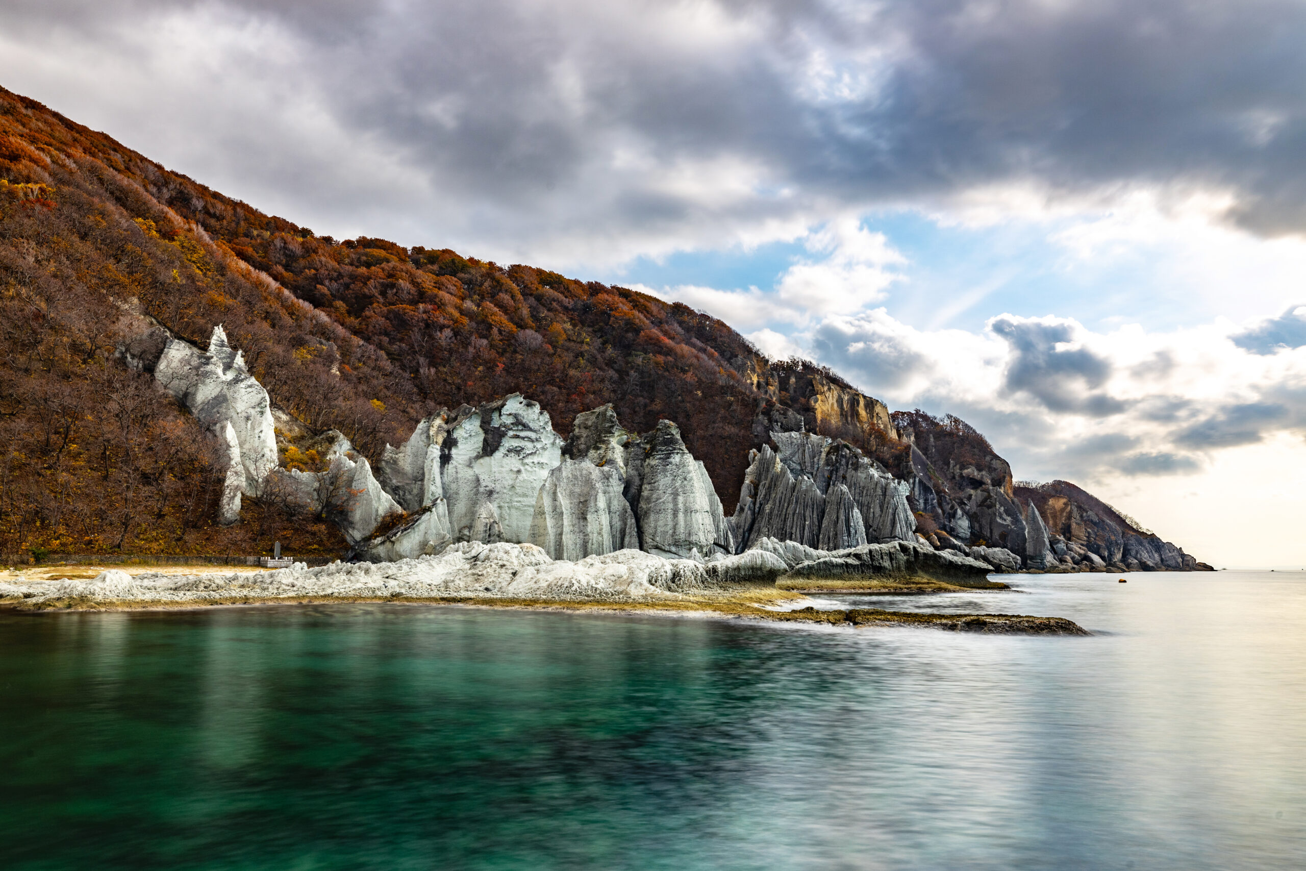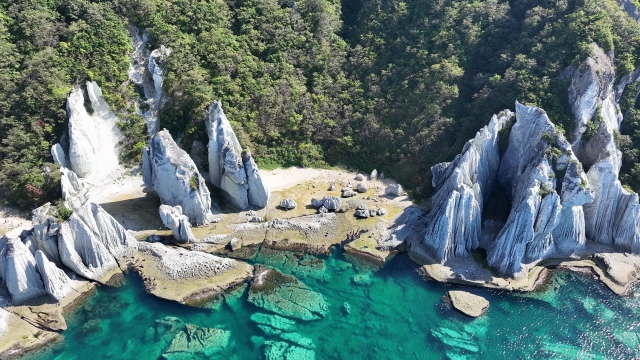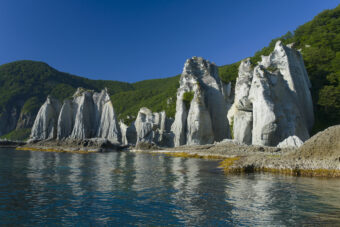 白緑色の奇岩が約2kmにわたって連なる仏ヶ浦。日本の秘境百選にも選ばれている絶景スポットで、極楽浄土を思わせる神秘的な世界が広がっています。長年の風雨と波により削られてできた巨岩群の圧倒的スケールはまさに圧巻です。