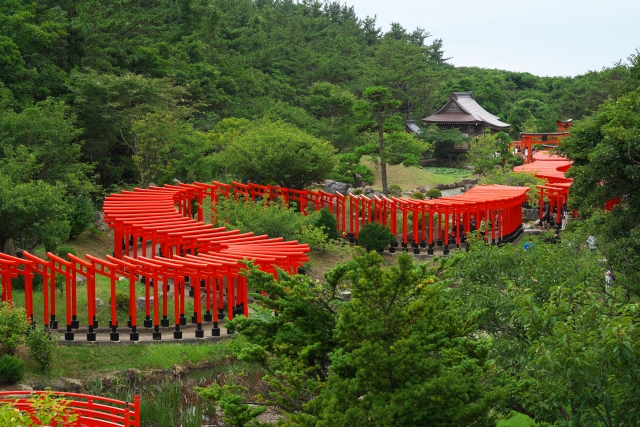 高さ約2メートルの鳥居が延々と並んでいる光景は圧巻!春は桜、夏は新緑、冬は真っ白な雪と、四季に映える朱色の鳥居が魅力で、写真映えすると人気を集めています。鳥居の奥にある高台からは全体を一望できます。無数に並ぶお稲荷様(狐の石像)も印象的です。