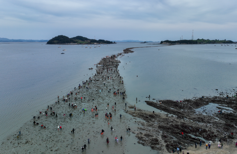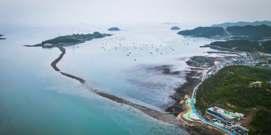 韓国南西部の全羅南道・珍島(チンド)で、春(主に3月〜4月)の干潮時に海面が分かれ、陸地から沖の島までの約2.8kmにわたる道が出現する現象です。潮の干満差が引き起こす自然現象で、「韓国版モーゼの奇跡」として有名です。この期間には「珍島海割れ祭り」が開催され、多くの観光客がその道の上を歩く体験を楽しんでいます。