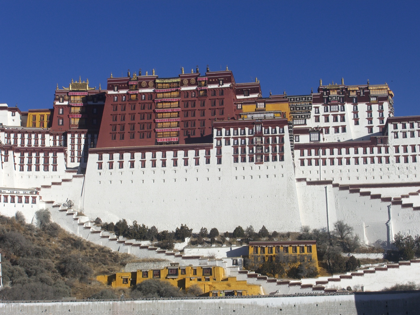 チベットの首都ラサにある、チベット仏教の教主ダライ=ラマの居城です。ポタラ宮はチベットを代表する象徴であり、チベット仏教の聖地でもあります。ポタラはチベット語で「観音菩薩が住まう地」という意味で、その化身であるダライ・ラマ法王を指しています。ポタラ宮は7世紀にソンツェン・カムポ王が唐から嫁いだ文成姫を迎えるために建てられたもので、現在まで1300年の歴史を持ち、宮殿、城、寺院が一体とした古建築群です。ラサ市の中心から北西に2㎞離れた紅山に位置し、高さ117m、長さ360m、外見からは13階建て、実際は9階建てであり、敷地面積41万㎡、建築面積13万㎡の非常に巨大で荘厳な宮殿です。また、最高高度は標高3767mに達し、世界一標高高い古代宮殿でもあり、麓から頂上までは900段以上の階段が続いています。
